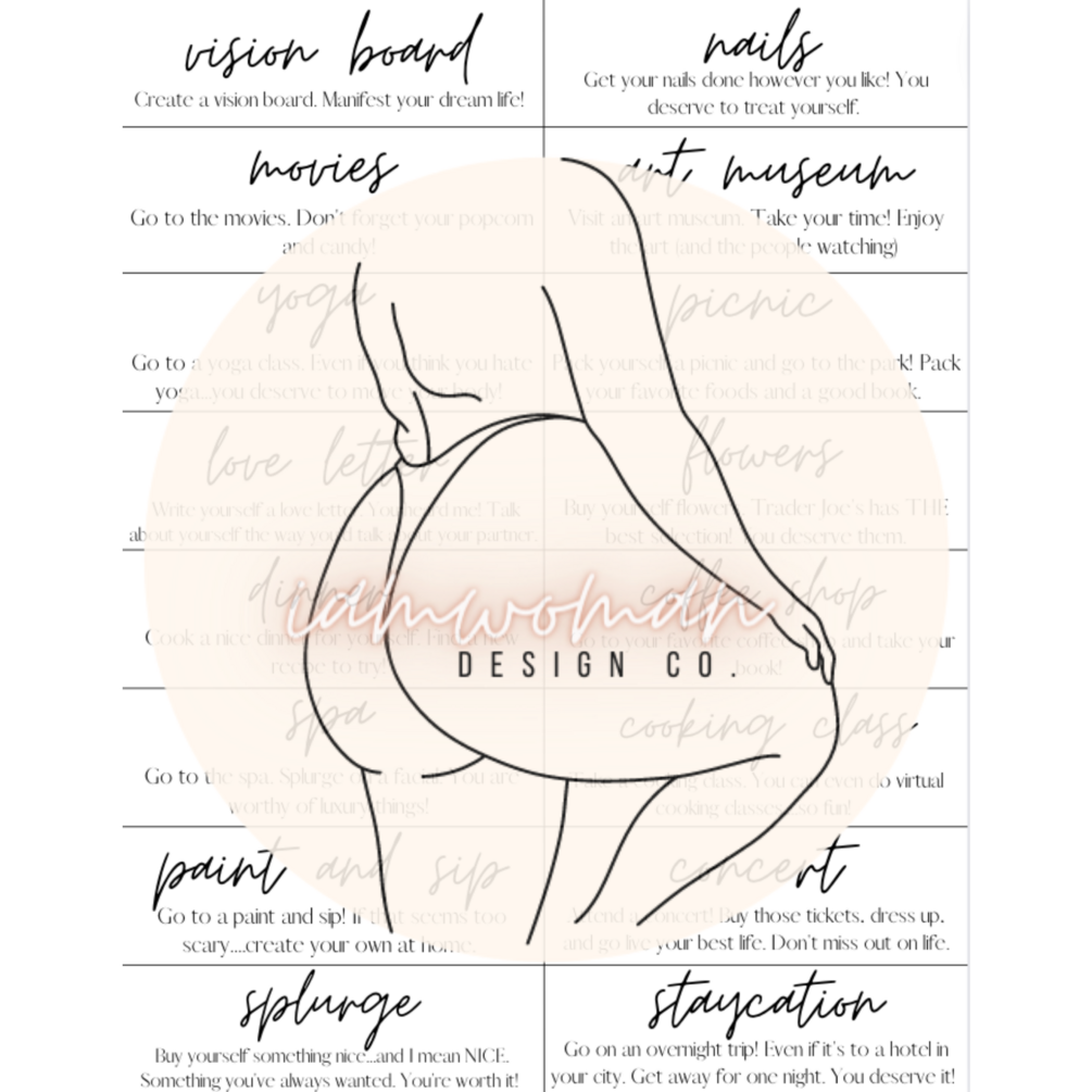 We designed these tasks to test your boundaries and become more comfortable being alone with yourself. We can't wait for you to make all of these memories and realize how much of a baddie you really are. Get ready for your standards to be RAISED after this! You deserve to love yourself